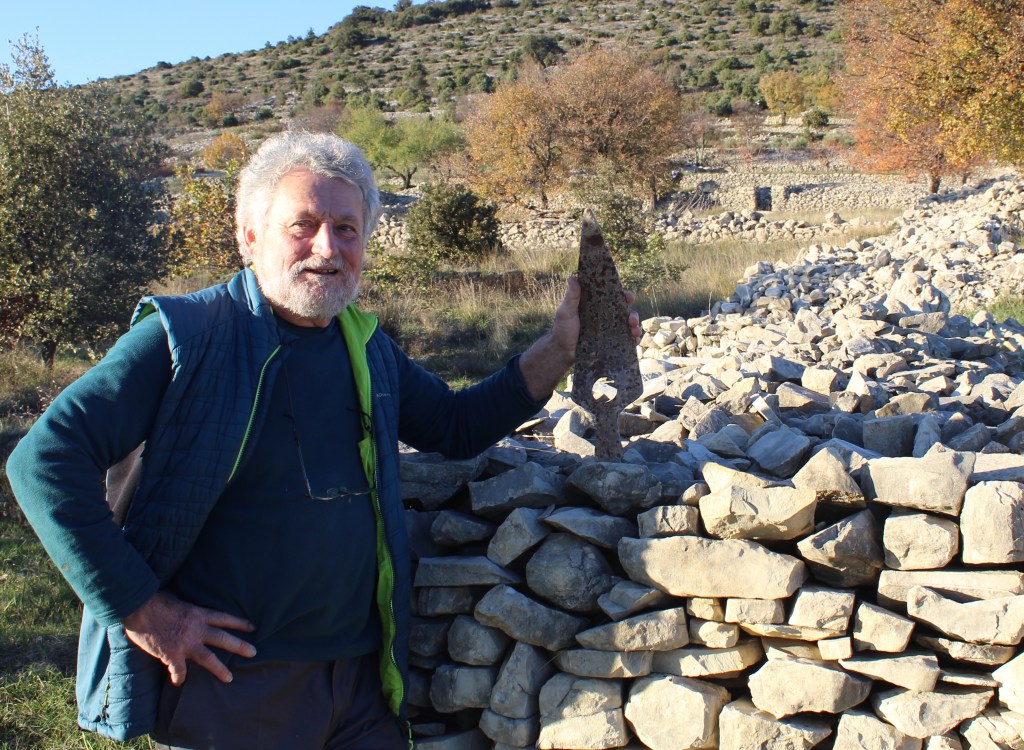 « On s’imagine toujours l’Ardèche comme une terre sauvage. Moi, je trouve au contraire que ce sont des paysages très anthropisés. La présence de l’homme est partout. Je ne suis pas originaire d’ici mais du Val de Loire ; quand je suis arrivé là, cela m’a tout de suite impressionné. Les anciennes terrasses de culture sont caractéristiques du coin. Ce sont des terrasses agricoles bordées de murets de pierre sèche, construites en gradins sur les pentes au nord du village à la fin du 18ème siècle et la première moitié du 19ème. À l’époque, toutes les familles du village possédaient des parcelles sur ces terrasses, qu’elles cultivaient de céréales, d’oliviers, de vignes, d’arbres fruitiers, de légumes secs et de pommes de terre. Ces terres nouvelles répondaient aux besoins alimentaires pressants avec l’augmentation de la population. En 1846, Saint-Remèze comptait 1087 habitants – soit plus qu’aujourd’hui ! Les terres de la plaine ne suffisaient plus, alors on bâtissait sur les versants de collines ; les murets de pierre sèche empêchaient que la pluie et le ruissellement n’emportent la terre. Tout cela a été pensé, réfléchi par des générations de paysans. Dans ces campagnes calcaires, ils ont manié des tonnes de caillasse pour aménager ces terrasses. C’était un travail gigantesque : il fallait défricher, défoncer, épierrer, trier les pierres, les appareiller, monter les murs, aménager la terre, niveler les terrasses. À certains endroits, les surfaces construites en pierre sèche sont plus importantes que les surfaces cultivables ! Tout cela, avec les instruments traditionnels de l’époque – pics, pioches, houes, bêches. On ne parle pas assez du travail que cela représente ; du labeur, du courage et de la solidarité de ces paysans. Ma maison est située dans l’une de ces anciennes parcelles ; chaque fois que je marche sur ces terres, je suis toujours en admiration, fasciné par cette œuvre de titan. On en parle toujours pour la Préhistoire, mais, pour moi, ces terrasses d’Ardèche sont la dernière civilisation de la pierre. »