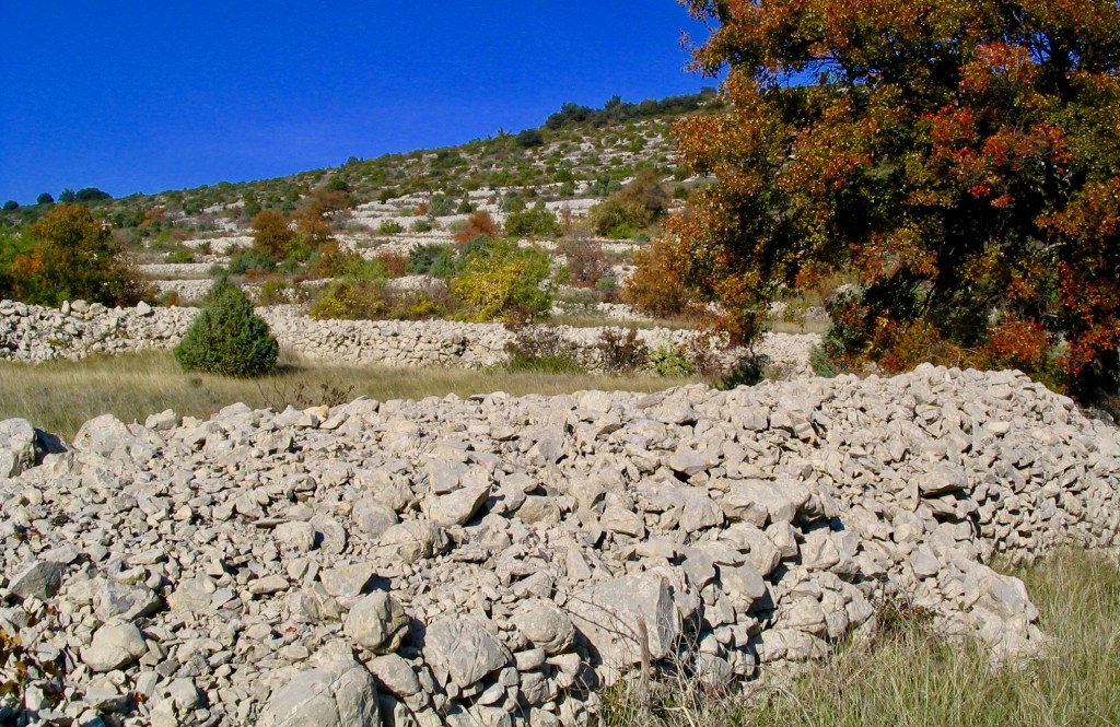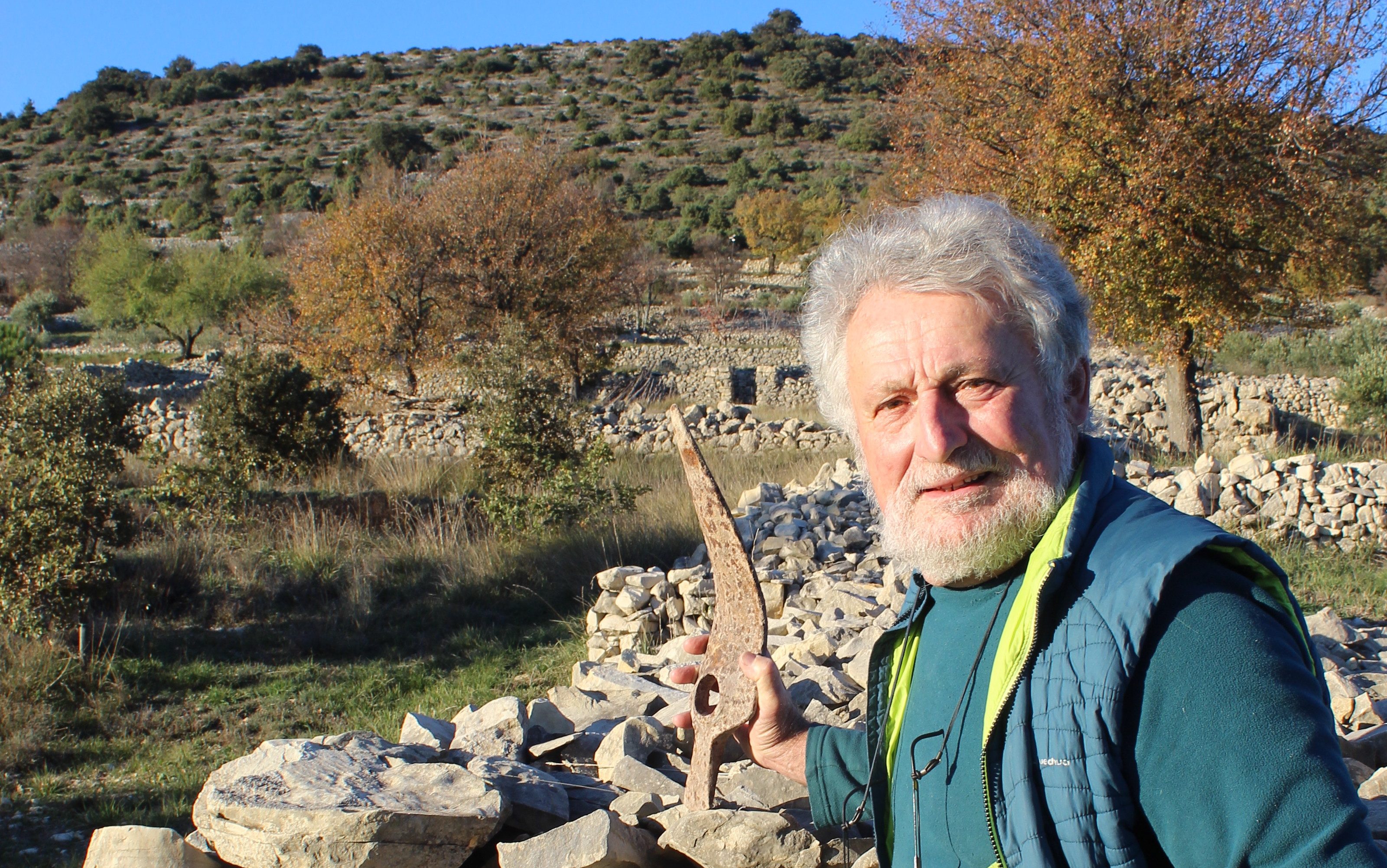 « On s’imagine toujours l’Ardèche comme une terre sauvage. Moi, je trouve au contraire que ce sont des paysages très anthropisés. La présence de l’homme est partout. Je ne suis pas originaire d’ici mais du Val de Loire ; quand je suis arrivé là, cela m’a tout de suite impressionné. Les anciennes terrasses de culture sont caractéristiques du coin. Ce sont des terrasses agricoles bordées de murets de pierre sèche, construites en gradins sur les pentes au nord du village à la fin du 18ème siècle et la première moitié du 19ème. À l’époque, toutes les familles du village possédaient des parcelles sur ces terrasses, qu’elles cultivaient de céréales, d’oliviers, de vignes, d’arbres fruitiers, de légumes secs et de pommes de terre. Ces terres nouvelles répondaient aux besoins alimentaires pressants avec l’augmentation de la population. En 1846, Saint-Remèze comptait 1087 habitants – soit plus qu’aujourd’hui ! Les terres de la plaine ne suffisaient plus, alors on bâtissait sur les versants de collines ; les murets de pierre sèche empêchaient que la pluie et le ruissellement n’emportent la terre. Tout cela a été pensé, réfléchi par des générations de paysans. Dans ces campagnes calcaires, ils ont manié des tonnes de caillasse pour aménager ces terrasses. C’était un travail gigantesque : il fallait défricher, défoncer, épierrer, trier les pierres, les appareiller, monter les murs, aménager la terre, niveler les terrasses. À certains endroits, les surfaces construites en pierre sèche sont plus importantes que les surfaces cultivables ! Tout cela, avec les instruments traditionnels de l’époque – pics, pioches, houes, bêches. On ne parle pas assez du travail que cela représente ; du labeur, du courage et de la solidarité de ces paysans. Ma maison est située dans l’une de ces anciennes parcelles ; chaque fois que je marche sur ces terres, je suis toujours en admiration, fasciné par cette œuvre de titan. On en parle toujours pour la Préhistoire, mais, pour moi, ces terrasses d’Ardèche sont la dernière civilisation de la pierre. »