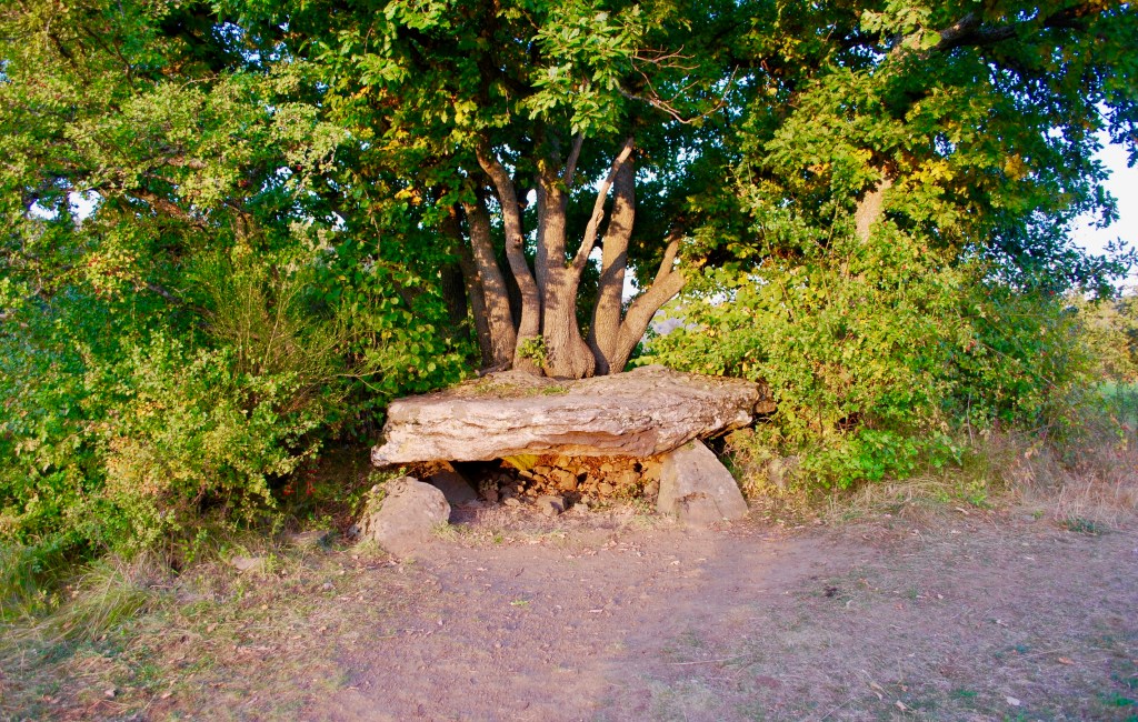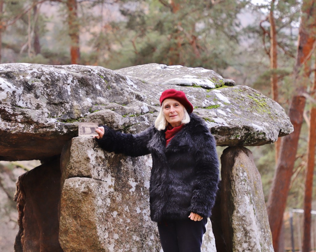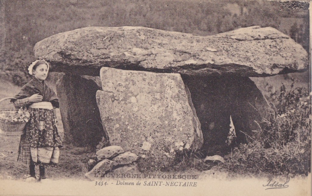 « Saint-Nectaire compte quatre dolmens et trois menhirs. Ces mégalithes fascinent les gens, au point de créer des histoires parfois farfelues. La légende raconte que le Dolmen du Saillant fut créé par un jeune héros, dont les pouvoirs surnaturels lui auraient permis de lancer un énorme palais de pierre qui se serait fiché dans le sol ! On l’appelle ainsi ‘le palet de Roland’. Les dolmens attirent parfois des confréries de druides, qui se prennent en photographie à côté, avec leurs habits blancs et leurs faucilles. Les menhirs, eux, ont été christianisés, puis déchristianisés, et rechristianisés ; on enleva leurs croix à la Révolution, pour les remettre au siècle suivant. Certaines furent volées, d’autres disparurent pour réapparaître un peu plus loin. Un mégalithe que j’aime beaucoup est le Dolmen du Parc. Il est situé dans le parc en bordure du chemin où j’habite ; et il est particulièrement beau, et très grand. On pense souvent qu’il s’agit d’un ancien autel pour les sacrifices, mais c’est en fait la structure restante d’une chambre funéraire, dernière partie d’un tumulus. Il y a plusieurs milliers d’années, il fut élevé par les populations du Néolithique, attirées dans la région par les vastes territoires pastoraux. Au 19ème siècle, on l’appela ‘Dolmen du Parc’ car il faisait partie du parc de la station thermale de Saint-Nectaire, où les malades en cure prenaient l’air et se promenaient. Aujourd’hui, ce dolmen est emblématique de la ville aux yeux de ses habitants, surtout des enfants. Dans mon enfance, c’était un lieu de balade idéal, car on pouvait s’y rendre seul, sans danger, et y jouer. On s’y cachait, on y faisait des cabanes, et, malgré l’interdit, on y allumait des feux avec des pommes de pains. On l’escaladait pour s’asseoir sur la pierre du dessus ; j’ai tant de photographies d’enfance perchée sur le dolmen, à tous les âges, hivers comme été, avec ou sans neige. Un jour, j’ai même un ami qui a tenté un saut à ski depuis le mégalithe ! Pour les enfants que nous étions, le parc du dolmen était un lieu magique – et il continue de fasciner les adultes que nous sommes devenus ! »