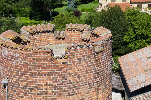 Ce donjon est particulier car il est fait de brique rouge – ce qui est caractéristique des constructions de la Dombes. Si l’est du département est une région montagneuse, avec des carrières, et des châteaux en pierres, ici, à l’ouest, c’est la terre argileuse déposée par un ancien glacier qui est devenu le matériau de prédilection. Ainsi, les maisons sont en terre (le pisé) et les châteaux en brique (les carrons). Ces briques étaient fabriquées sur place, tout près de chez nous, dans des lieux dits ‘carronières’. C’est un matériau qui perdure, et les vestiges sont encore là aujourd’hui. Puisque les briques étaient fabriquées manuellement et cuites à différents degrés, les murs et les tours du château présentent un camaïeu de rouge, du très clair au rouge foncé. Je trouve ça très intéressant, car c’est une trace du savoir-faire des gens. »