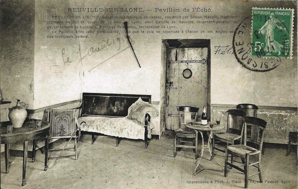 « C’est une bâtisse de pierre carrée à deux étages. Elle fut construite au 17ème siècle pour Monseigneur Camille de Neuville, comte et archevêque de Lyon, et neveu du pape. Il s’en servait comme d’un pavillon de chasse. Le gibier était abondant, et d’illustres personnages sont venus y chasser, les rois Louis XIII et Louis XIV, Mademoiselle de Montpensier. À la Révolution, les héritiers du pavillon furent guillotinés, et la bâtisse saisie et vendue ; et, vers 1900, ce sont mes arrière-grands-parents qui la rachetèrent. Ils n’y vivaient pas : c’était un rendez-vous de chasse. À l’époque, on y venait en tramway à vapeur depuis Lyon afin de chasser, avec des fusils, et on y festoyait après, avec les victuailles gardées dans la cave. Puis la chasse s’est arrêtée. Pour moi, pour nous aujourd’hui, il est connu sous le nom de ‘pavillon de l’Écho’, en raison du phénomène d’écho surprenant qui se fait entendre d’un angle à l’autre du bâtiment. Dans mon enfance, le pavillon était le lieu des promenades familiales du dimanche. On récupérait la clef à la ferme, en bas, et puis on gravissait la hauteur et on passait la journée dans le jardin, sous les tilleuls, avec la vue sur les environs. Moi j’entrais dans la bâtisse et je m’amusais à chuchoter aux angles. Aujourd’hui encore, quand j’y retourne, j’emporte toujours un vieux réveil avec moi, pour tester cet écho ! »