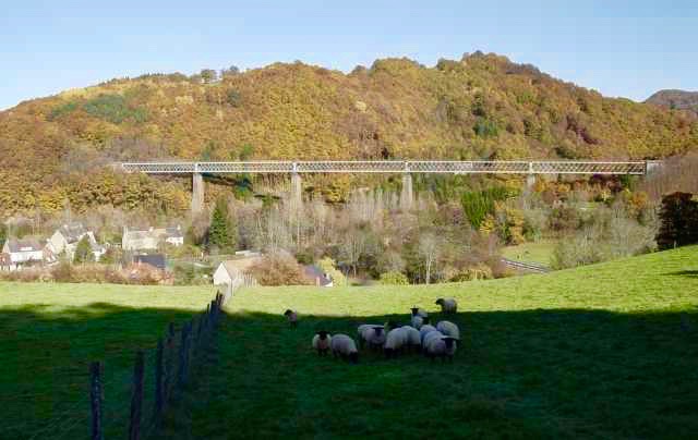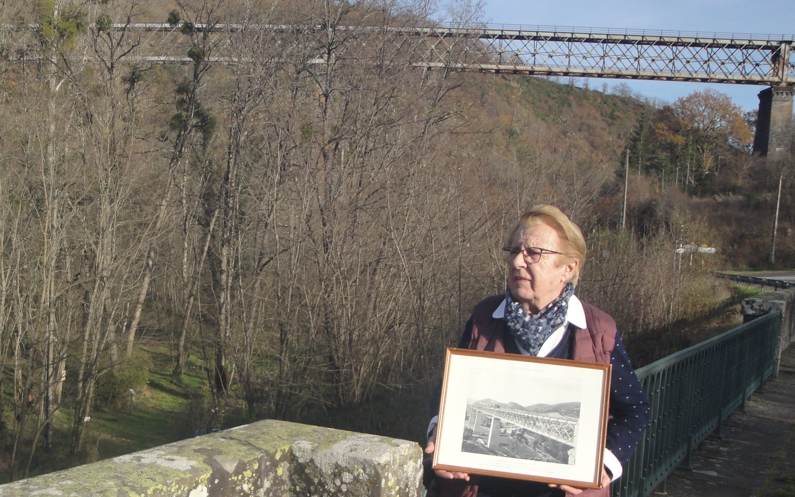 « Ce n’est pas que je le trouve beau, mais j’aime sa simplicité et sa légèreté. C’est aussi sentimental : mon enfance a été rythmée par les trains à vapeur qui passaient sur cet ouvrage de fer et d’acier. Le viaduc enjambe le village, la route et la rivière. Le passage des trains faisait partie de la vie quotidienne. Un monstre d’acier sortait soudain du tunnel, dans un fracas assourdissant. On avait le temps d’agiter son mouchoir vers un membre de sa famille ou un ami qui faisait signe depuis la portière. Les enfants s’émerveillaient. Je me souviens encore de l’excitation de mes neveux, lorsqu’ils y sont montés pour la première fois ; aujourd’hui, après avoir fait de grands voyages en avion, ils se souviennent encore de ce voyage mythique là. Combien de fois ai-je emprunté cette ligne, pensionnaire collégienne, puis lycéenne, et plus tard encore ? Le viaduc servait aussi aux trains de charbon. Les deux chauffeurs-mécaniciens qui les conduisaient avaient de la famille dans le village : aussi, lorsqu’ils passaient sur le viaduc, ils lâchaient de la vapeur dans un sifflement strident selon des codes différents, reconnus par leurs familles en contrebas. C’était assez cocasse ! À la Libération, le Général de Gaulle a effectué un tour de France en train, accompagné du Sultan du Maroc. Le train est passé par mon village et s’est arrêté à la gare du village. Avec une camarade, nous avons remis des bouquets de fleurs aux deux personnages. Mes jambes étaient trop courtes, je tremblais, et j’ai dû me hisser pour atteindre la fenêtre. J’ai encore en esprit l’image du général s’encadrant dans la portière du train : trop grand, il se courbait légèrement. Je l’ai raconté, récemment, et mes amis m’ont reproché de ne l’avoir pas fait plus tôt. Mais c’est simplement qu’à l’époque ça ne les intéressait pas ; aujourd’hui, alors que le train ne passe plus et que l’ouvrage se rouille, c’est une image que je garderai toujours. »