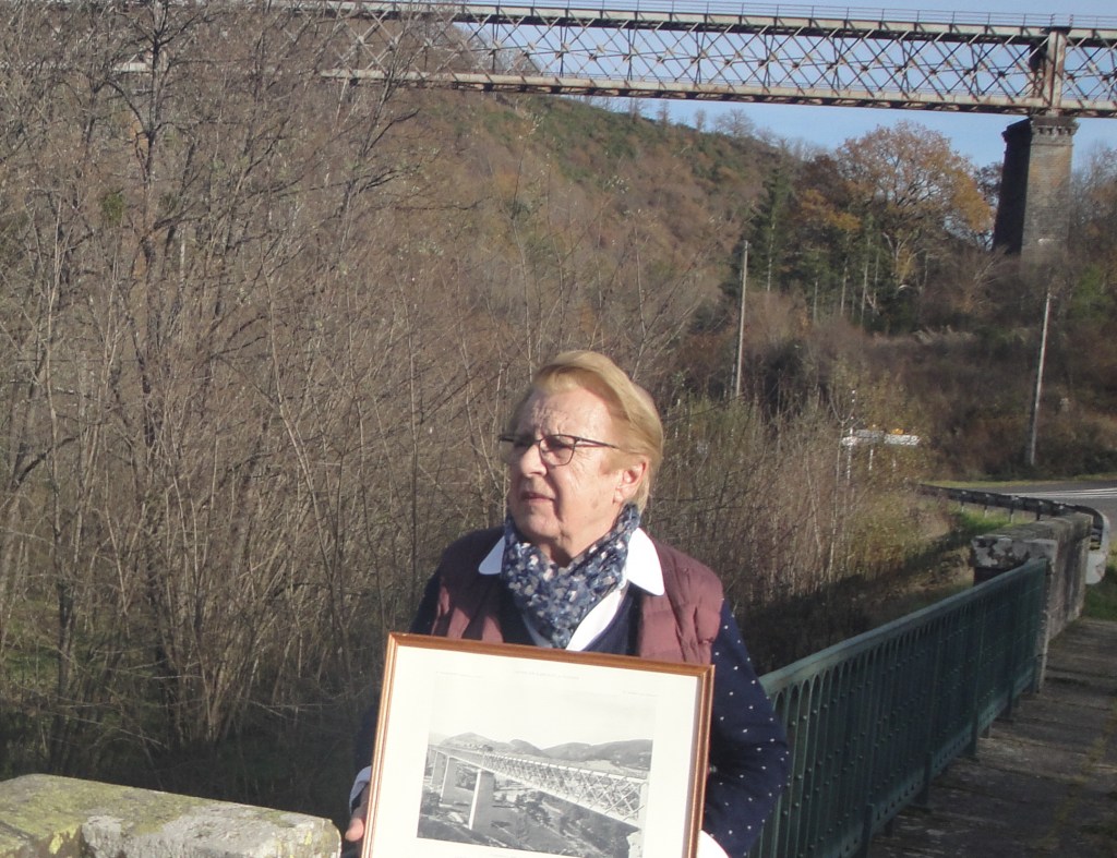 « Ce n’est pas que je le trouve beau, mais j’aime sa simplicité et sa légèreté. C’est aussi sentimental : mon enfance a été rythmée par les trains à vapeur qui passaient sur cet ouvrage de fer et d’acier. Le viaduc enjambe le village, la route et la rivière. Le passage des trains faisait partie de la vie quotidienne. Un monstre d’acier sortait soudain du tunnel, dans un fracas assourdissant. On avait le temps d’agiter son mouchoir vers un membre de sa famille ou un ami qui faisait signe depuis la portière. Les enfants s’émerveillaient. Je me souviens encore de l’excitation de mes neveux, lorsqu’ils y sont montés pour la première fois ; aujourd’hui, après avoir fait de grands voyages en avion, ils se souviennent encore de ce voyage mythique là. Combien de fois ai-je emprunté cette ligne, pensionnaire collégienne, puis lycéenne, et plus tard encore ? Le viaduc servait aussi aux trains de charbon. Les deux chauffeurs-mécaniciens qui les conduisaient avaient de la famille dans le village : aussi, lorsqu’ils passaient sur le viaduc, ils lâchaient de la vapeur dans un sifflement strident selon des codes différents, reconnus par leurs familles en contrebas. C’était assez cocasse ! À la Libération, le Général de Gaulle a effectué un tour de France en train, accompagné du Sultan du Maroc. Le train est passé par mon village et s’est arrêté à la gare du village. Avec une camarade, nous avons remis des bouquets de fleurs aux deux personnages. Mes jambes étaient trop courtes, je tremblais, et j’ai dû me hisser pour atteindre la fenêtre. J’ai encore en esprit l’image du général s’encadrant dans la portière du train : trop grand, il se courbait légèrement. Je l’ai raconté, récemment, et mes amis m’ont reproché de ne l’avoir pas fait plus tôt. Mais c’est simplement qu’à l’époque ça ne les intéressait pas ; aujourd’hui, alors que le train ne passe plus et que l’ouvrage se rouille, c’est une image que je garderai toujours. »