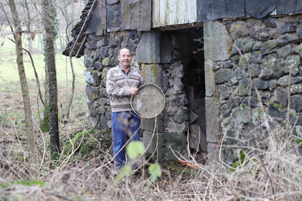 « Je chasse et je pêche régulièrement. Quand je me rends à la rivière, chaque mois, je passe près du moulin à eau. C’est une bâtisse en chaux, costaud, qui date du Moyen-Âge peut-être. Au début du siècle dernier, chaque village autour de Saint-Nectaire avait son four banal, et chacun y faisait son pain. Dans les années 40, sous l’Occupation, le moulin était en ruine, abandonné, et les gens du village ne pouvaient plus faire leur pain. Dix-sept familles du village, dont la mienne, ont alors décidé de se cotiser pour le rebâtir. Pouvoir moudre son blé, récolter sa propre farine et faire son pain était un joli projet en cette période de restriction. Chacun apporta du temps, des matériaux et d’argent ; mais un boulanger eu vent de l’initiative et les dénonça aux autorités. Le moulin fut mis sous scellés. Heureusement, un villageois ingénieux trouva un moyen de le faire fonctionner sans détruire les scellés. Ainsi, durant toute l’Occupation, les villageois firent tourner le moulin en secret, deux fois par semaine, la nuit. Aujourd’hui, le moulin appartient toujours à 15 familles du village – les descendantes de celles de 1940. J’en fais partie. Depuis la destruction du four le moulin ne fonctionne plus, alors j’essaie de l’entretenir moi-même. Je suis menuisier de métier, et je fais tout mon possible pour entretenir la bâtisse, avec un copain maçon. La toiture est faite de pierres qui s’effritent ; j’aimerais la refaire. Pour ça, j’ai besoin de l’accord de toutes les familles ; mais certaines, des étrangers au village dont c’est la maison secondaire, ne veulent pas en entendre parler. Ça serait chouette pourtant : à 4 ou 5 villageois, pendant quelques jours, avec des casse-croûtes, le job serait fait facilement. C’est une histoire de moulin, et c’est une histoire de bien-être entre personnes de connaissance ! »