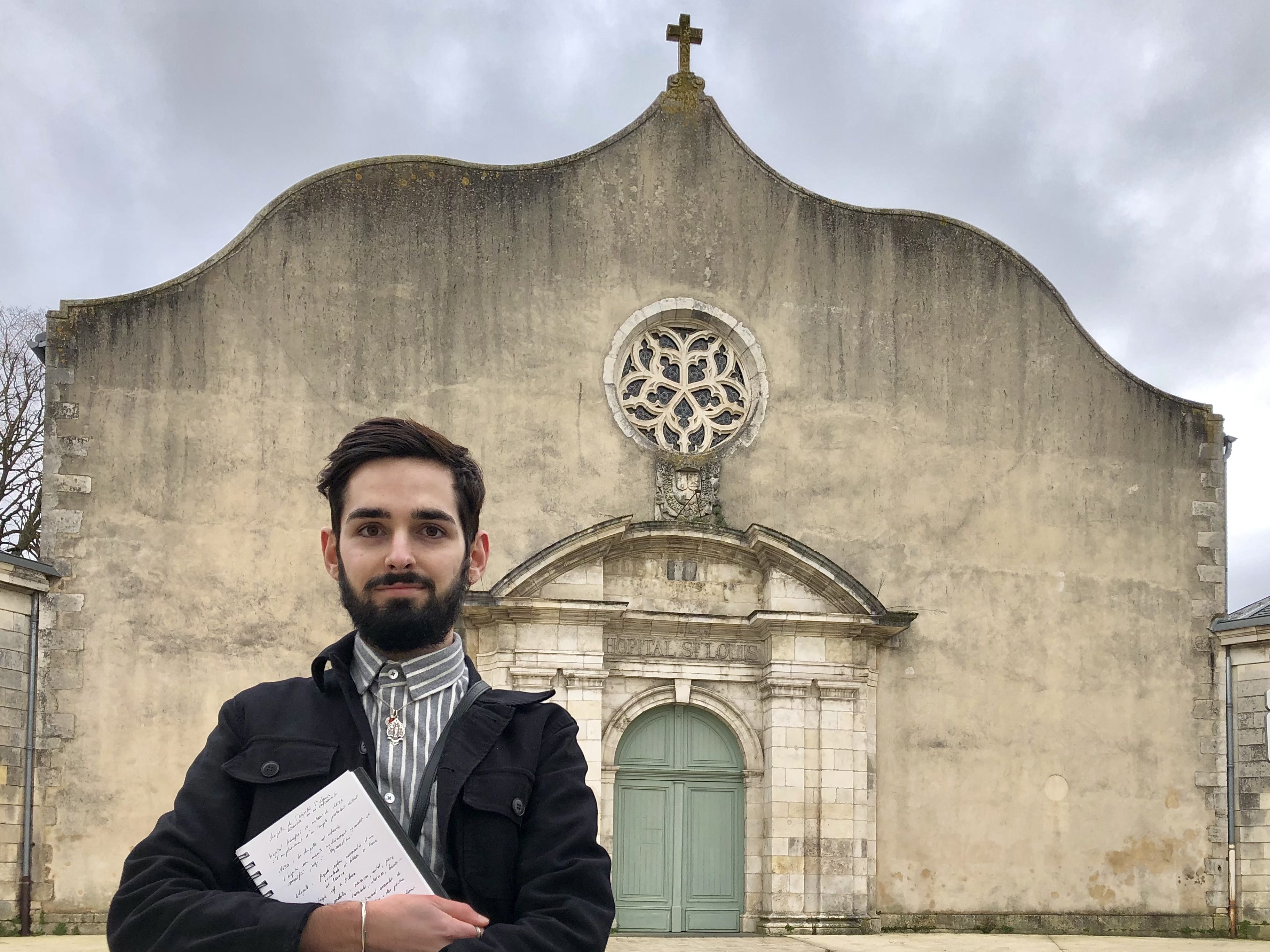 « Mon intérêt premier est pour les peintures, et j’aime le patrimoine religieux en raison des tableaux qu’on peut y trouver. J’ai l’habitude d’arpenter les rues de la ville, et je connaissais de vue cette chapelle, celle de l’hôpital. Donnant sur une rue passante, elle possède une façade sobre, avec un mur lisse et un portail simplement sculpté. Une légende locale veut que la pierre au-dessus du portail, sur laquelle est gravé le blason de France et de Navarre, provienne d’un temple protestant, détruit durant des conflits entre catholiques et protestants, qui se tenait là autrefois. J’avais toujours vu la chapelle fermée ; un jour, en passant devant, je vis la porte entrouverte. Ce fut une révélation. Je pense que c’est véritablement lorsqu’on entre à l’intérieur que l’on comprend qu’il y a là quelque chose d’inhabituel et de formidable. La chapelle recèle un ensemble exceptionnel de tableaux. Nombre sont en mauvais état, mal éclairées et difficilement accessibles, certains ayant probablement été déposés ici suite aux transformations ou destructions d’autres églises, et ainsi réunis sous les coups du hasard dans cette petite chapelle. En arpentant l’édifice désert, j’ai découvert des œuvres de peintres originaires de la région, adaptant des sujets traditionnels au goût local : un tableau représentant la Foi dominant le port de la ville, un autre signé par un peintre de la marine… L’ancienne tribune de bois dissimule le plus remarquable : une immense toile sombre, pratiquement invisible d’en bas. J’ai toujours été intrigué par les questions de provenance – pour quels bâtiments de la ville ces tableaux étaient-ils destinés ? – et je pense que celui-ci pourrait avoir appartenu à un ancien réfectoire de la ville. Je suis souvent retourné à la chapelle depuis, lorsque je me pose une question sur une peinture ou que je souhaite vérifier n’avoir pas raté de détail. Il n’y a jamais beaucoup de monde, ni qui entre dans la chapelle ni qui en remarque les tableaux ; mais je sais que, lorsqu’on s’y intéressera, on découvrira des choses fascinantes. »