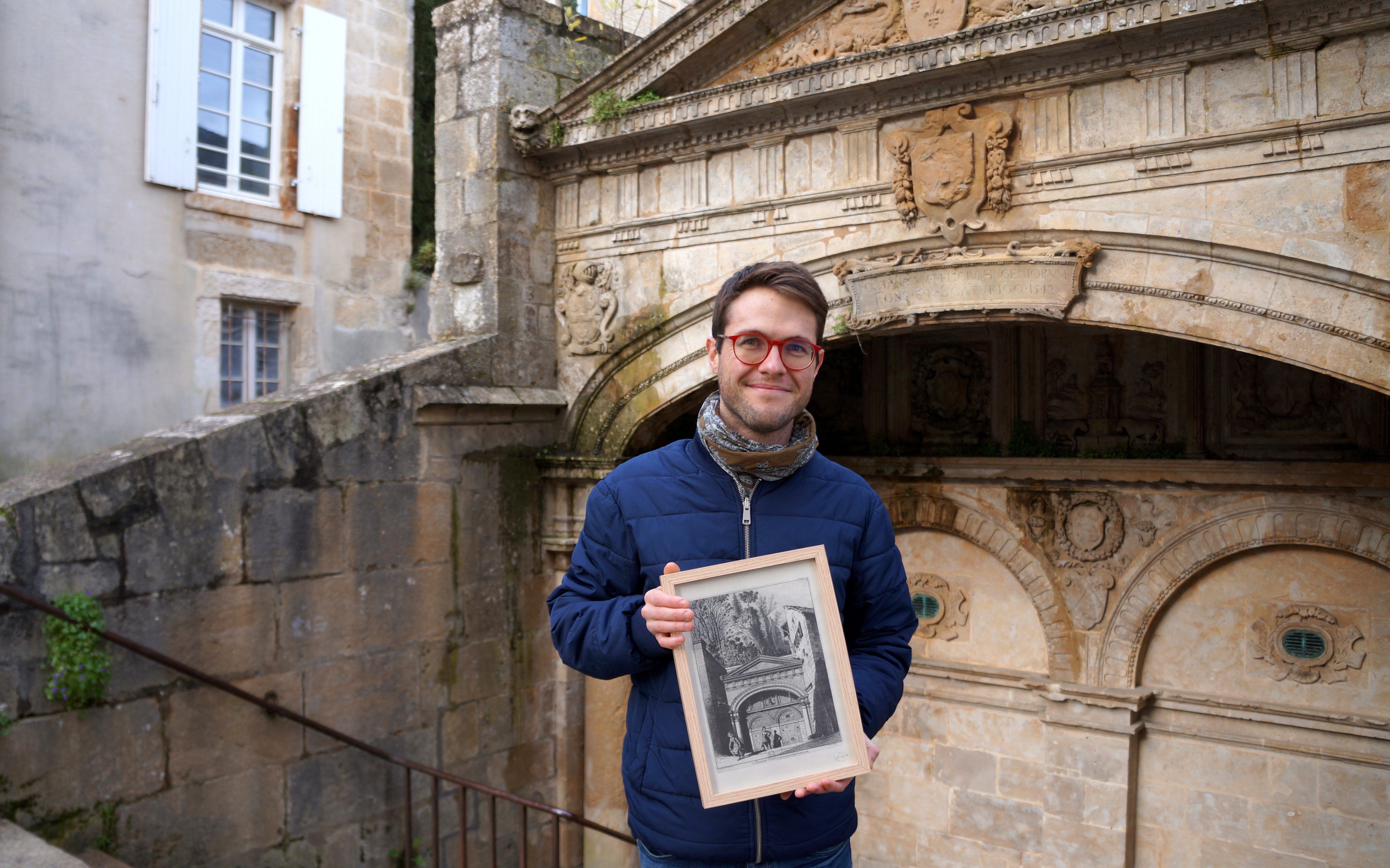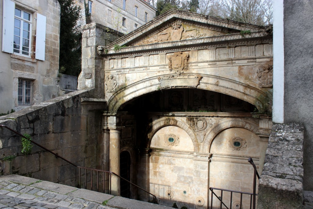 « C’est une ville à laquelle on ne s’attend pas. Dans cette région au tourisme majoritairement balnéaire, elle demeure peu connue et possède quelque chose de surprenant, de complètement préservé. C’est sans doute cette dimension-là, son côté inattendu, qui m’a poussé à m’y intéresser. L’un de ses monuments emblématiques est la fontaine des Quatre-Tias – un terme d’ancien français régional signifiant ‘quatre tuyaux’. Elle fut érigée au 16ème siècle, dans une pierre locale assez blonde qui rappelle que le Sud n’est pas très loin. Quelques décors sculptés d’origine y figurent, telles des licornes s’abreuvant à la source, ainsi que des ajouts plus tardifs, remplaçant à la fin du 19ème siècle des bas-reliefs buchés lors de la Révolution. Belle, elle est aussi symbolique : elle fut bâtie sur l’emplacement d’une fontaine plus ancienne qui donna son nom à la cité et joua probablement un rôle dans le choix d’installation de ses premiers habitants. Dans cette ville d’humanistes et d’intellectuels, cette fontaine fut construite dans un style classique novateur pour son temps. Elle devançait ainsi de quelques années la fontaine des Innocents de Paris – ce qui paraît presque irréel aujourd’hui, dans un lieu aussi secondaire du royaume ! Parce que petite et encaissée dans la ville, la fontaine se fond dans le corps urbain, composé de petits monuments qui se mêlent dans ce que j’appellerais un ‘monument global’. La fontaine doit aussi être un peu comme un membre de la famille pour ceux qui vivent à côté d’elle. À titre personnel, c’est un monument près duquel je me promène, le jour comme la nuit, et un prétexte justifiant détours et crochets dans mes balades à travers la ville. Elle est aussi un moyen de prendre le pouls du climat, en observant l’intensité du filet d’eau et l’état de la nappe phréatique qui l’alimente. La fontaine n’est ainsi pas simplement un objet de pierre d’où sort de l’eau, mais un témoignage de l’état environnemental de la région ; pas seulement du patrimoine, mais une fontaine vivante ! »