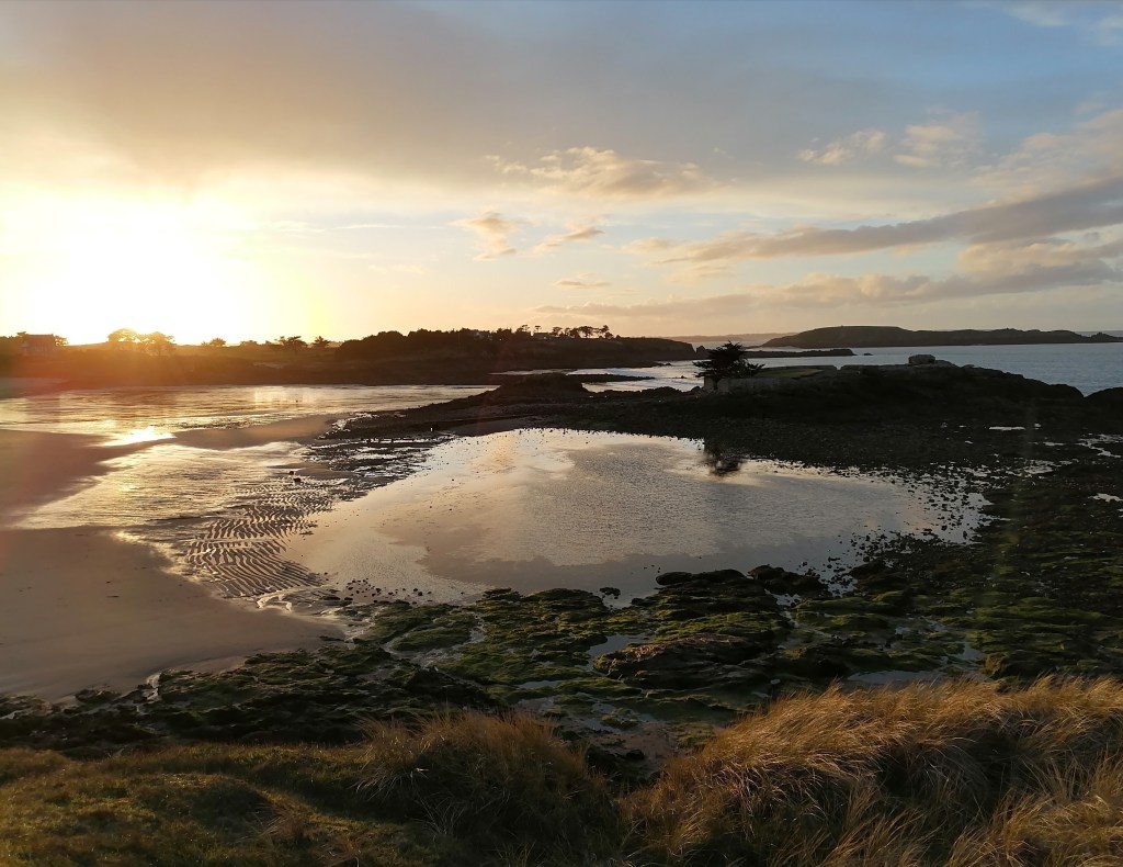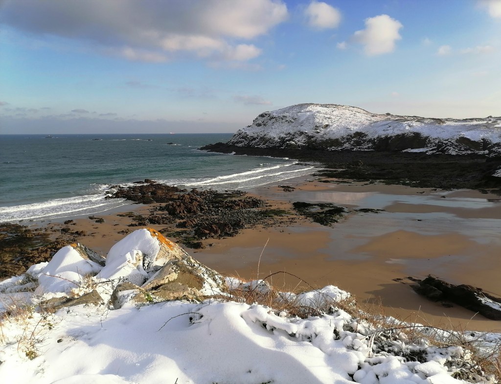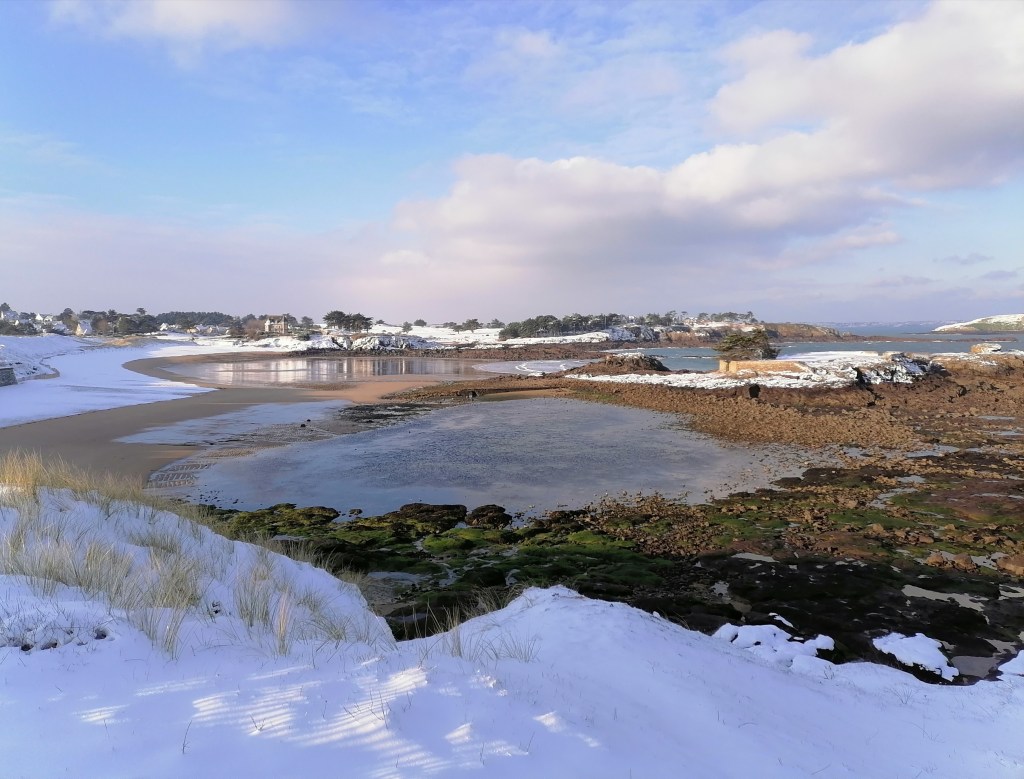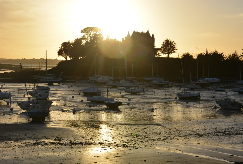 Le Sentier des douaniers fut creusé au 18ème siècle, le long des côtes et falaises de la Bretagne ; nuit et jour, des patrouilles de douaniers le sillonnaient pour prévenir la contrebande. Aujourd’hui, pour la passionnée de photographie que je suis, c’est un chemin exceptionnel. Je l’ai vu sous le soleil, la pluie et la neige ; il offre toujours quelque chose à voir, à revoir ou à découvrir. Depuis Saint-Briac, le sentier offre un point de vue dégagé sur toute la côte, avec une luminosité et des couleurs toujours changeantes. Cette année, j’y suis allée lorsqu’il neigeait ; la blancheur confondait la côte et la mer. C’était insolite et magnifique. Un jour, alors que je photographiais le coucher de soleil depuis Saint-Briac, un vieil homme s’est écrié que je devais aller à Lancieux, de l’autre côté de la baie, pour admirer le plus beau coucher de soleil depuis le sentier ! Et il avait raison.
