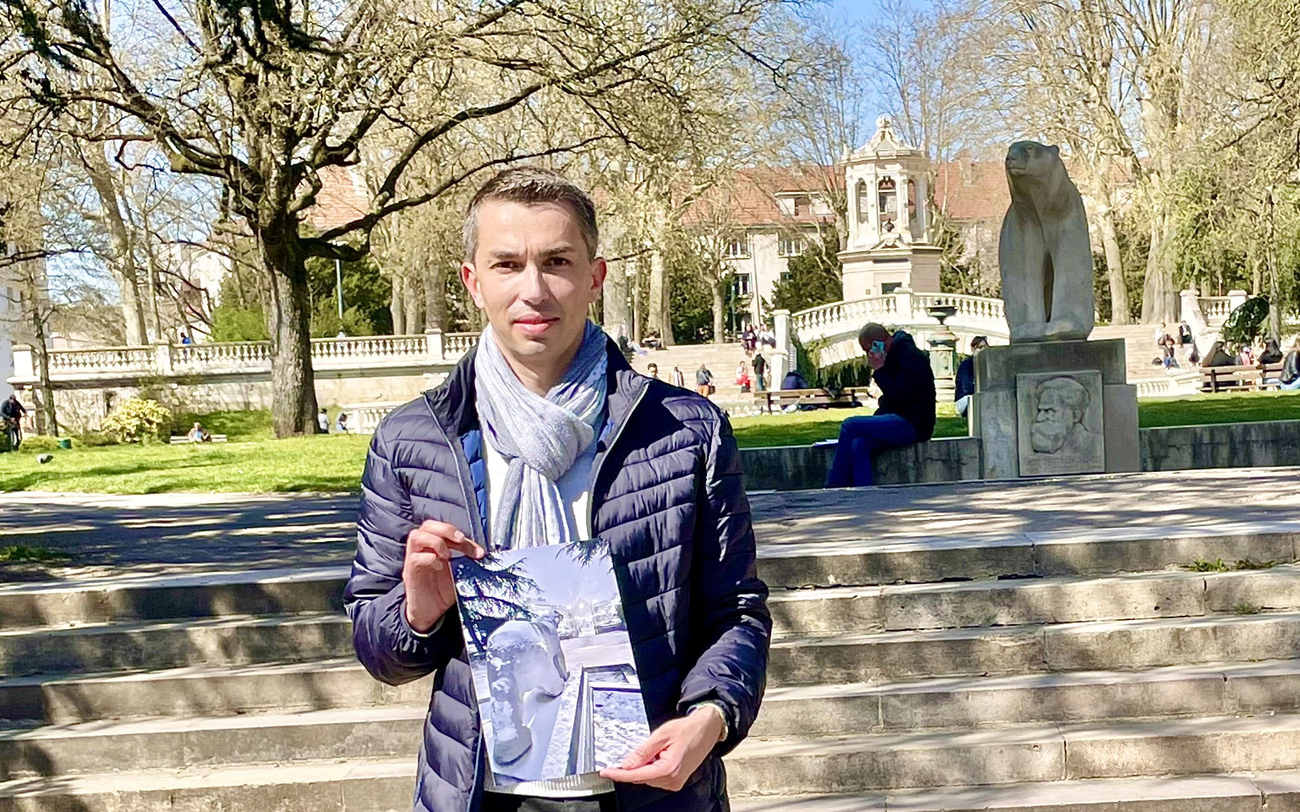 « Ce jardin est l’un de mes endroits préférés de photographie. A la base, je suis sportif, au niveau national ; avec le confinement qui empêche le sport, j’ai repris la photographie de façon intensive. Ce jardin offre des possibilités infinies de photographie. Ce que j’aime faire, c’est jouer sur les angles et les perspectives pour faire redécouvrir la ville aux habitants. Et ce jardin s’y prête à merveille, offrant des vues différentes sur les arbres, la fontaine, le bassin de pierre et la sculpture de l’ours de François Pompon, auxquels s’ajoutent les variations des lumières et des saisons. Parfois, avec un groupe de photographes locaux, on choisit un lieu particulier du jardin sur lequel tous se concentrent ; à la fin, chacun obtient un résultat différent. Cet hiver, j’ai terminé deuxième d’un concours de photographie avec une photographie prise dans ce jardin, de la sculpture de l’ours sous la neige. Je trouve cette œuvre élégante ; selon l’angle, on a l’impression que l’ours est en mouvement et s’apprête à sortir du jardin. La photographie permet de lui donner vie. Situé au cœur de la ville, ce jardin est un lieu emblématique de Dijon. Moi qui connaît bien New-York, c’est un peu comme un Central Park à taille humaine. Il accueille les enfants qui jouent, les étudiants qui révisent, les amis, les amoureux… J’y ai des souvenirs de sandwichs pendant les pauses au lycée et de révisions de mon bac ; aujourd’hui, c’est mon fils que j’y emmène jouer les jours de soleil lorsqu’il sort de l’école. Souvent, lorsque je le dépose le matin, je fais un détour par ici ; pas forcément pour y rester, mais simplement pour voir le jardin, le traverser. Il y a de ces lieux pour lesquels on a un coup de cœur, et c’est pour moi un besoin instinctif : mes pas m’y guident, inconsciemment parfois, et regarder l’endroit me met du baume au cœur pour le reste de la journée. »