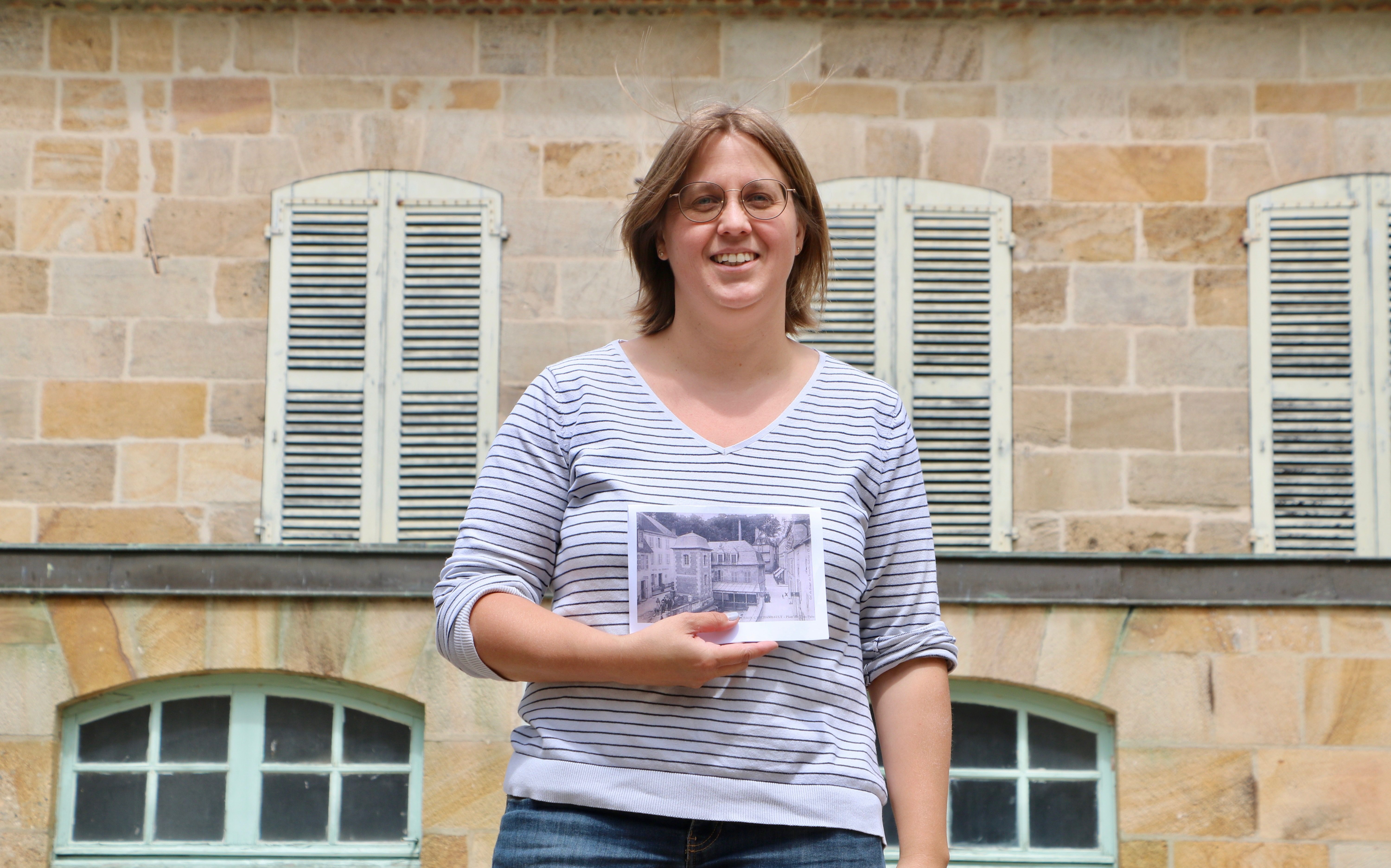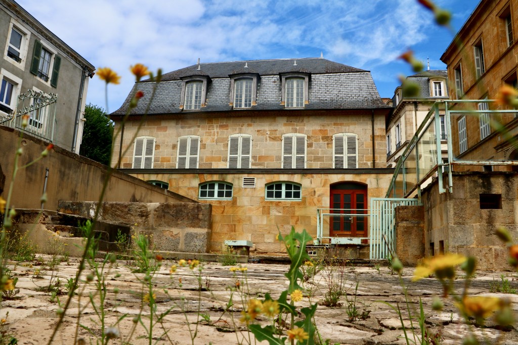 « C’est sans doute la ville qui m’a choisie, plutôt que l’inverse. À l’école, j’avais fait un exposé sur les villes thermales – sans me douter ce qui m’attendait ! J’y avais déjà des souvenirs : mon arrière-grand-mère faisait sa cure ici et, enfant, je lui rendais visite l’après-midi. Nous nous promenions dans les allées. Puis j’ai fait un premier stage ici et, à chaque fois que je quittais la ville, sous les coups du hasard, on m’a rappelée. Le Logis accueillait alors un musée du thermalisme et de la vie paysanne, où j’officiais comme guide. À l’origine, il avait été le premier établissement thermal de Bourbon. Il fut bâti en 1645 par le frère du roi, Gaston d’Orléans, sur les conseils du médecin royal, Charles Delorme – un auvergnat qui croyait aux vertus thérapeutiques des eaux locales. Sous la supervision des moines capucins, la cour royale venait prendre les eaux ici. D’où le surnom moderne du bâtiment : ‘le Logis du Roy’. D’ailleurs, le nom de la ville et des ducs, Bourbon, vient de borvo, le dieu celte des eaux bouillonnantes. J’aime penser, par un grand raccourci, que la famille royale est liée, par l’histoire comme par l’étymologie, à l’eau de cette ville ! La source se trouve ici, sous les trois puits du Logis. Toute la ville dépend de cette eau, qui n’est pas inépuisable. Je trouve que cela donne beaucoup d’humilité. C’est d’ailleurs une bâtisse humble, rustique, épaisse, en grès de carrières proches. J’aime ses pierres aux motifs disparates et qui se transforment en vieillissant car, chargées de fer, elles rosissent à mesure qu’elles s’oxydent. Le Logis détonne dans son environnement, sur cette place où tout fut bâti plus tard, où les époques se bousculent et se percutent. Je sais que ça n’est pas le bâtiment le plus beau de Bourbon. Mais il est là depuis le début, solide, authentique, comme si le temps n’avait pas de prise sur lui. Ancré dans la ville, par l’eau, par les racines, par le sol. Comme un point de départ. »